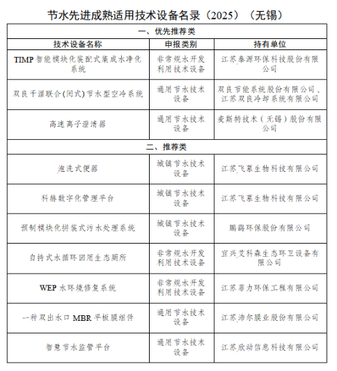 无锡市10项节水技术设备入选水利部《节水先进成熟适用技术设备名录(2025年)》